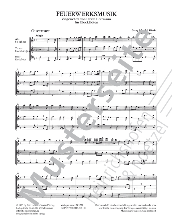 Obwohl Händel für die "Feuerwerksmusik" eine reiche Instrumentierung mit Oboen, Fagotten, Kontrafagott, Hörnern, Trompeten, Pauken und Streichern vorgesehen hat, ist sie im Kern nur dreistimmig. In der vorliegenden Bearbeitung für Blockflöten wurde die Stimmenzahl auf diesen Kern reduziert.