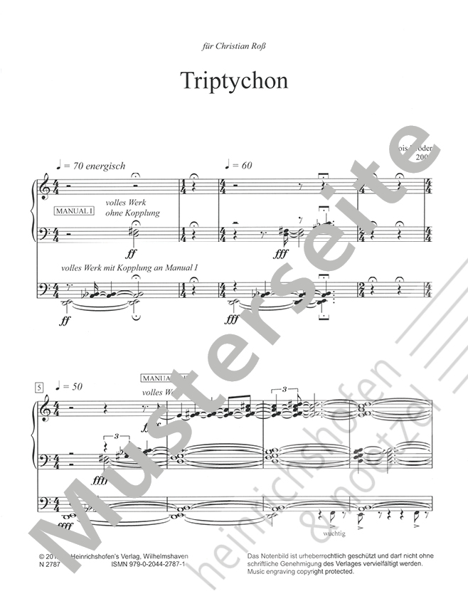 Bei einem Besuch in der Kathedrale von Coutances, Normandie: Stimmengewirr der anderen Besucher, ein Gastorganist probiert verschiedene Registrierungen aus, der dadurch ausgelöste Blick ins eigene Innere. In den drei extrem kontrastierenden Abschnitten des "Triptychon" hält Alois Bröder diese Erfahrung noch am selben Tag musikalisch fest. Dabei repräsentiert vor allem der dritte und weitaus längste Teil in seiner äußersten Zurückgenommenheit das Erlebnis der Verbindung der sinnlich wahrnehmbaren Welt mit dem eigenen Inneren.