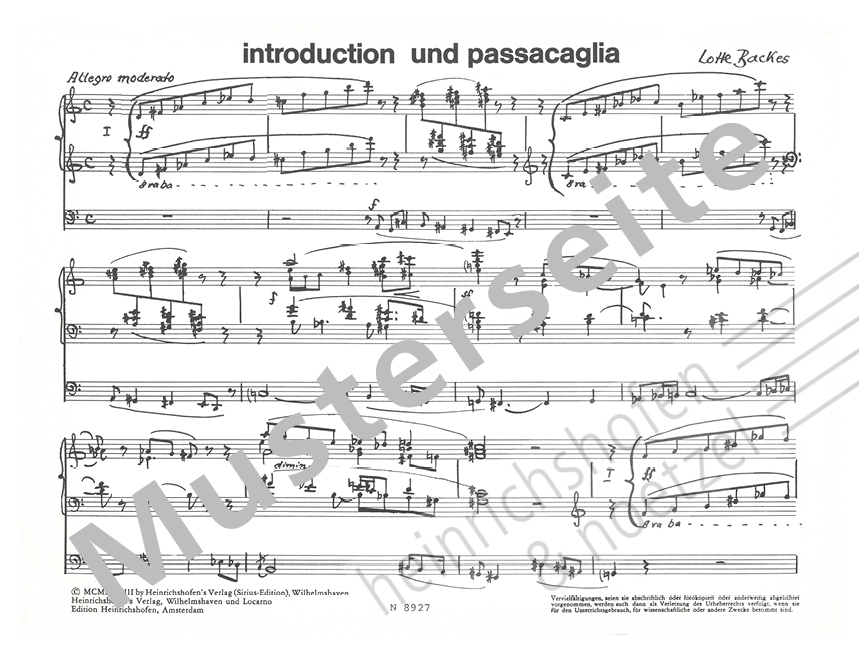 Lotte Backes (1901 - 1990), recipient of the Federal Cross of Merit for her lifetime achievement in composition, was a pianist, organist and composer. She composed many organ works and chamber music pieces, including toccatas, partitas, passacaglias, improvisations, etc.