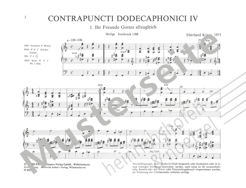In the Contrapuncti dodecaphonici, melodies from Gregorian chants and hymns in the local language are arranged in the following sequence of twelve tones, inversion, inversion of the inversion, in all possible transpositions.